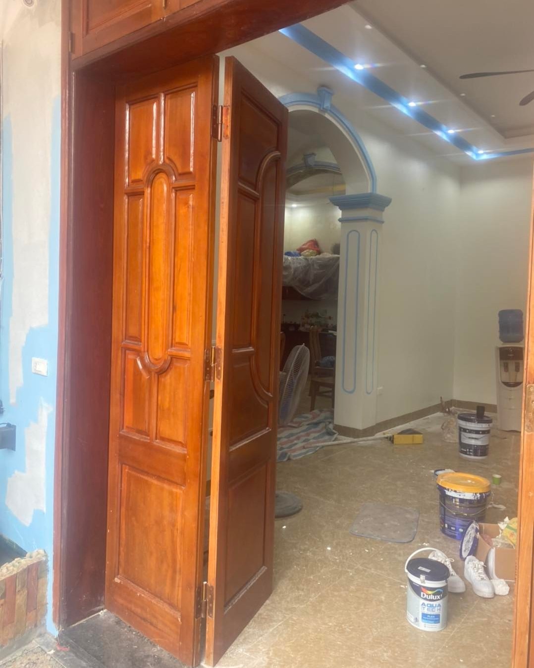 Đội ngũ sơn PU cửa gỗ ngoài trời tại Hà Nội của LALA làm việc chuyên nghiệp, đảm bảo tiến độ và giữ vệ sinh không gian.